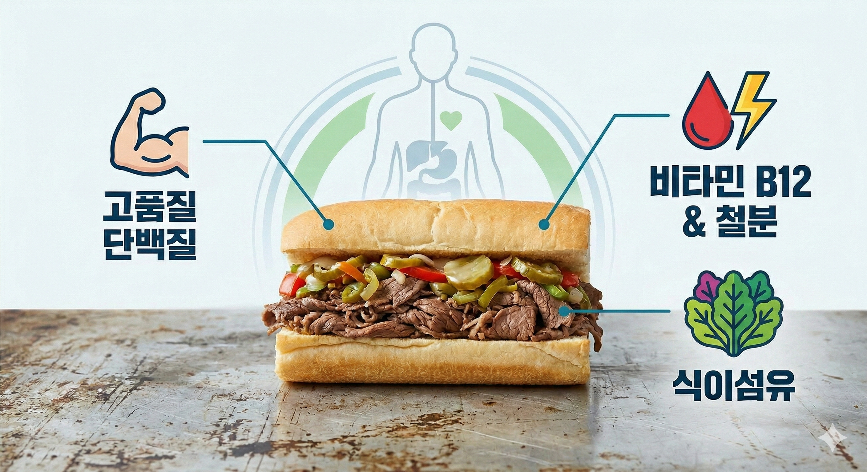 이탈리아 비프 샌드위치는 단순한 '패스트푸드'가 아닙니다. 장시간 저온 조리된 소고기와 발효 채소의 조화로 이루어진 고단백 건강식에 가깝습니다.