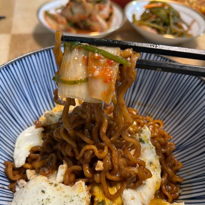 짜장라면 특유의 고소함과 치즈의 풍미, 계란의 부드러움이 만나 맛의 깊이가 배가됩니다.